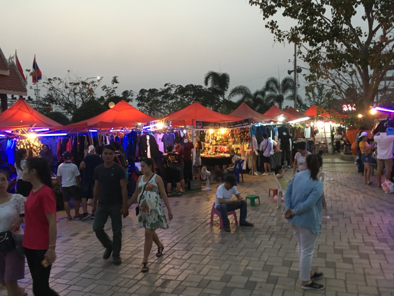 メコン川への夕涼みがてら冷やかして歩く程度がちょうど良い感じのナイトマーケットです。観光客に特化しておらず、地元の人が例えば日用品を買い足しに来たりとか、スマホのカバーを変えるための品定めに来るような感じです。特段買うべきものは見当たりませんでした。ゆえに財布を持たずにぶらぶら散策する位で十分かと。