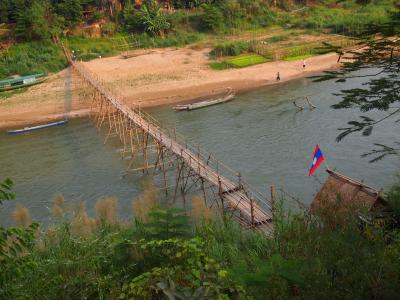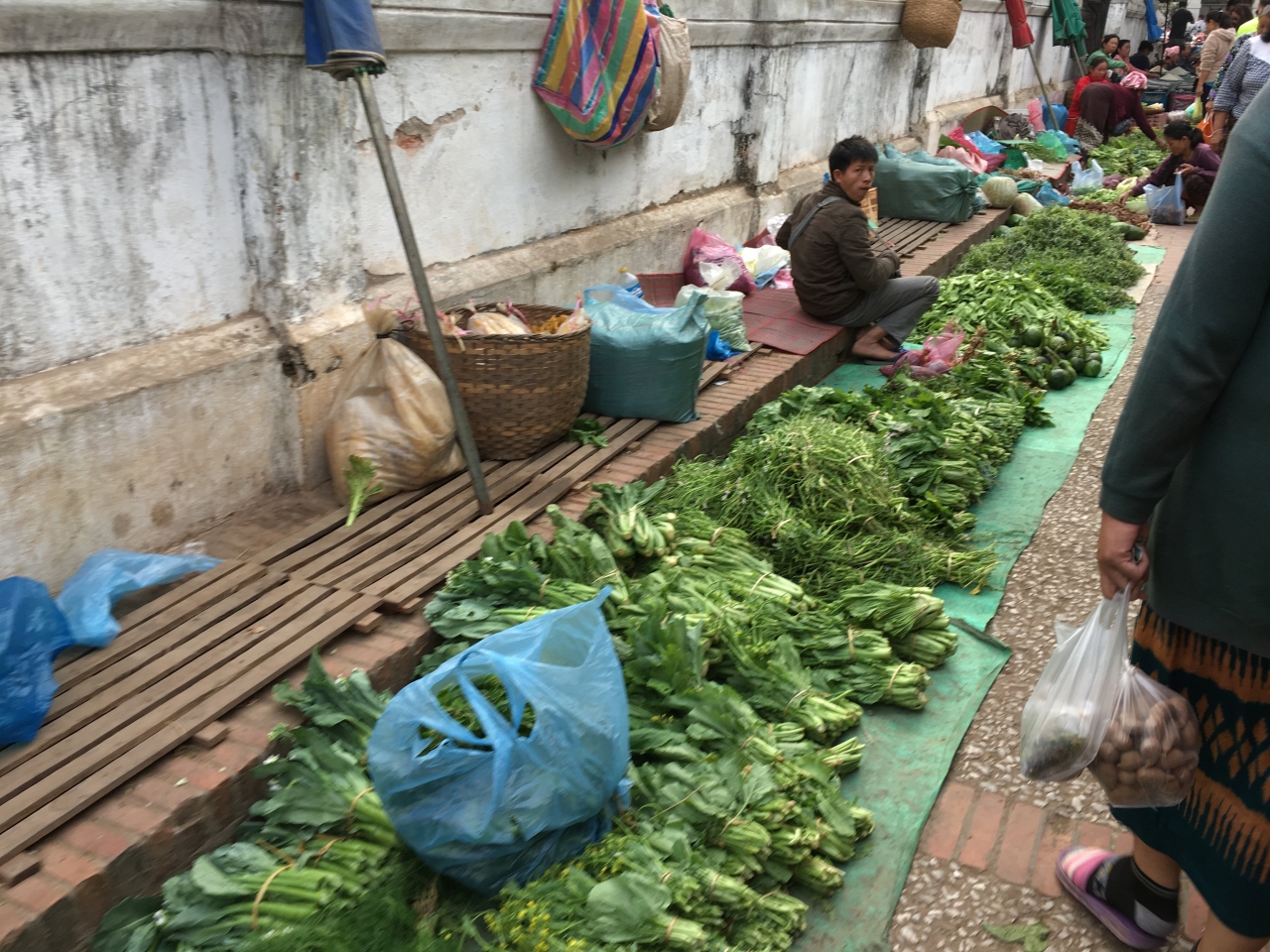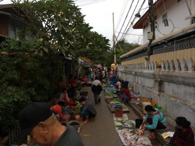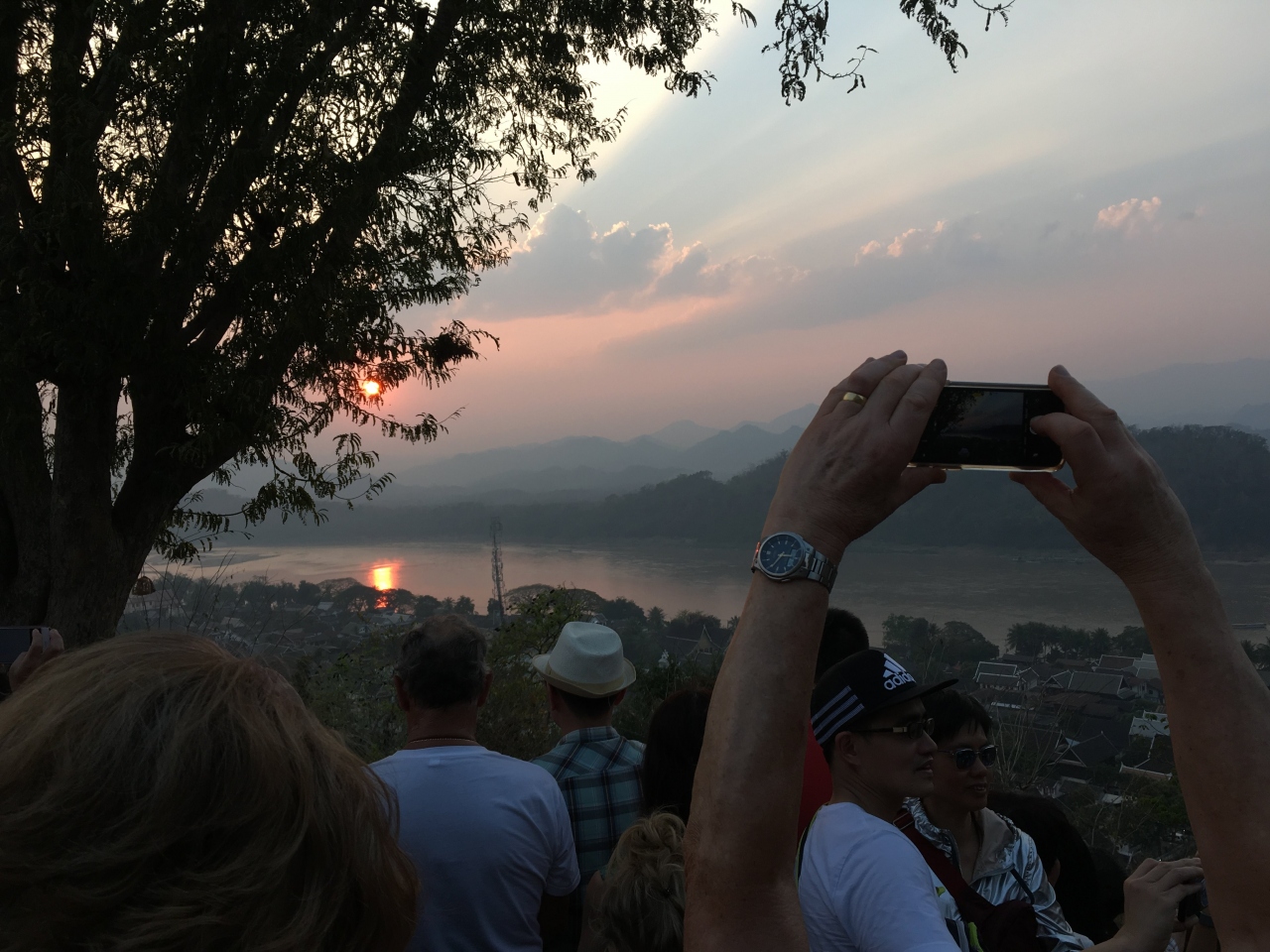 ルアンパバーンに着いたら、街の全貌把握も兼ねて夕陽の名所=プーシーの丘へ。国立博物館の真ん前にある入り口が分かりやすいはず。ゲートで20000kipを支払えば、のっけから急傾斜の階段が待ち構えていてたじろぎますが、さほど高さもないので休み休みどうぞ。日没1時間半前に登ったらすでにてっぺんは凄まじい人出でした。メコンに向けて遮るものが少ない前の方に陣取るのがベストとはいえ、立錐の余地なし。逆に他の人が背後に来ない最後列だと、少し小高くなっていたのでベターです。