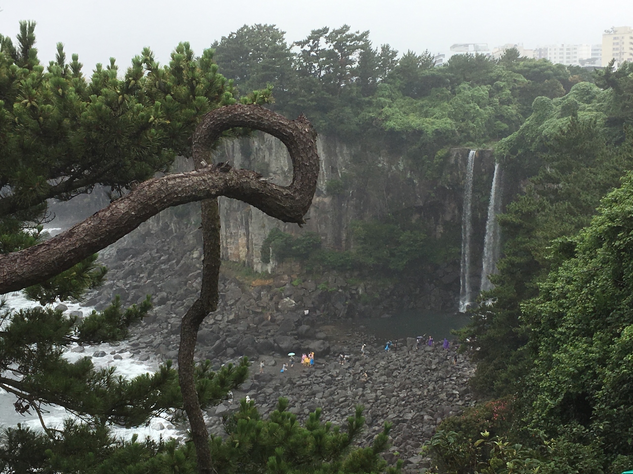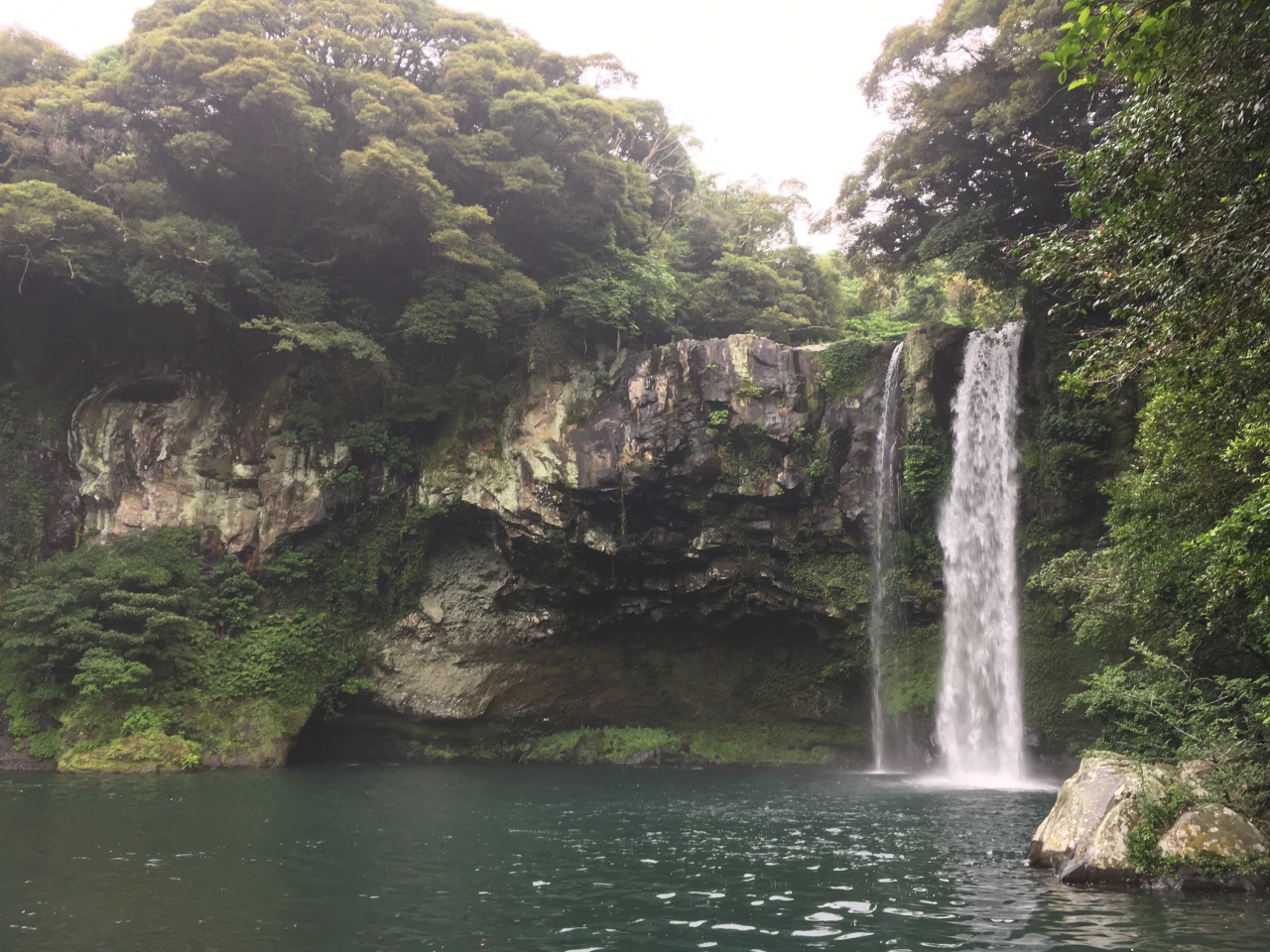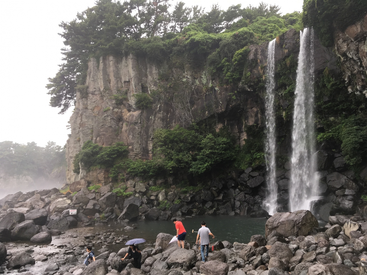 西帰浦の中心街から比較的アクセスしやすいスポットです。島から直接海に降り注ぐ滝はなかなか日本では見られない光景でした。訪ねた日は雨がそぼ降り、駐車場から滝のそばを結ぶ階段も滑りやすく、さらに滝の近くまで行こうと思うと、ツルツル滑る岩だらけ。慎重に歩を進める自分の傍らで、ひょいひょい滝つぼのそばまで近付こうとする韓国の男子たちがことごとく転倒していました。ハイヒールの類では危険です。もし滝のそばまで行きたい場合は履き慣れたスニーカーで是非。