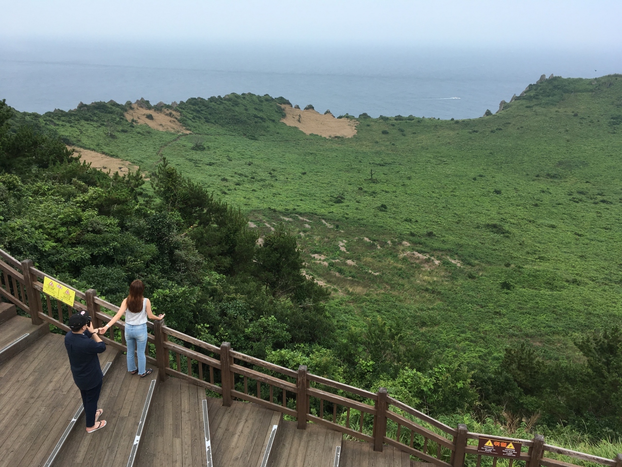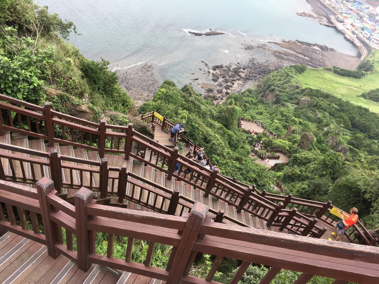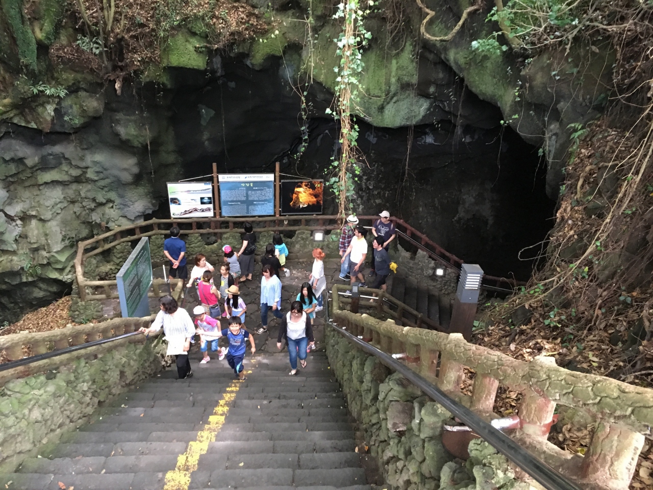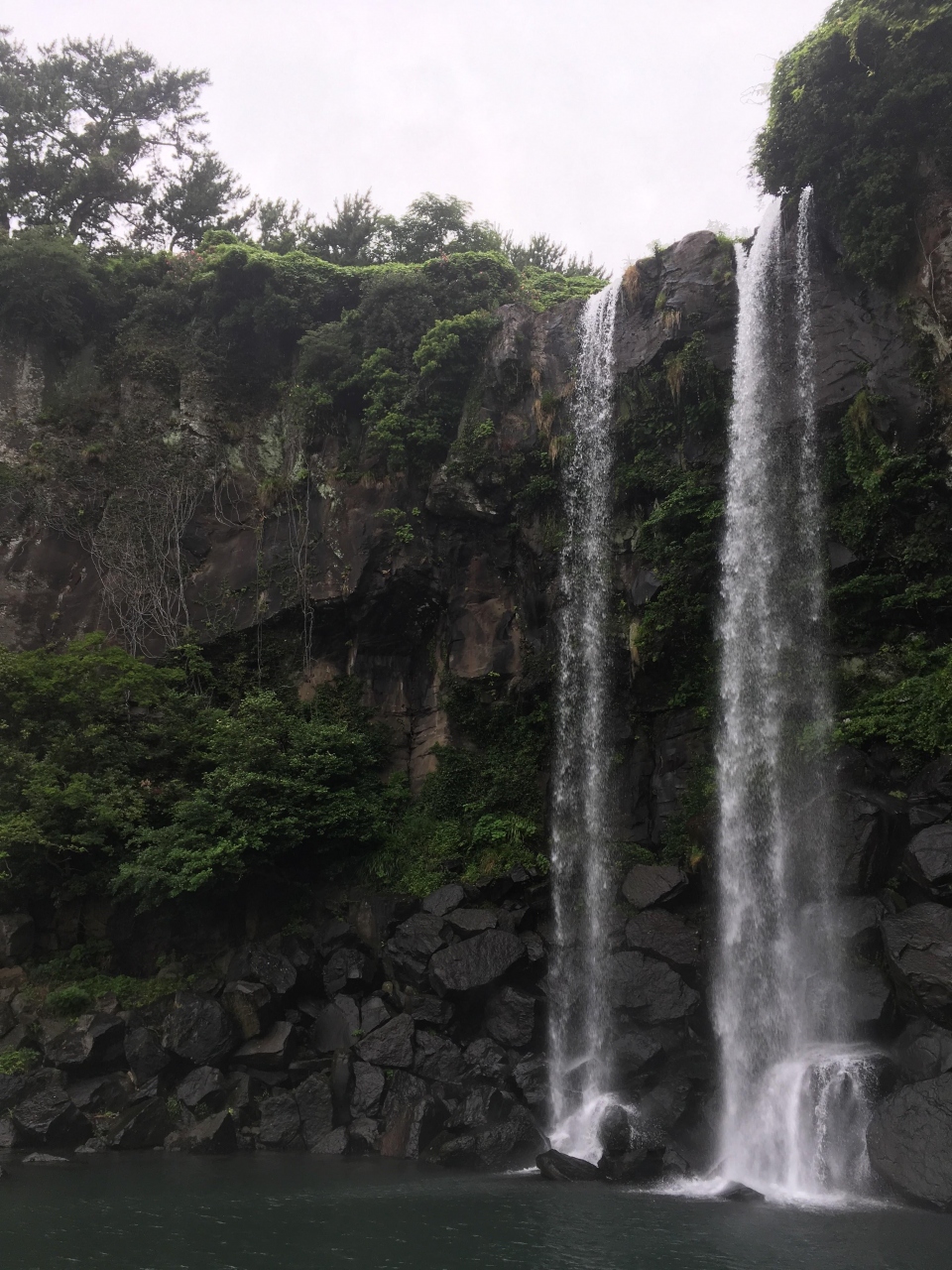 西帰浦の中心街から比較的アクセスしやすいスポットです。島から直接海に降り注ぐ滝はなかなか日本では見られない光景でした。訪ねた日は雨がそぼ降り、駐車場から滝のそばを結ぶ階段も滑りやすく、さらに滝の近くまで行こうと思うと、ツルツル滑る岩だらけ。慎重に歩を進める自分の傍らで、ひょいひょい滝つぼのそばまで近付こうとする韓国の男子たちがことごとく転倒していました。ハイヒールの類では危険です。もし滝のそばまで行きたい場合は履き慣れたスニーカーで是非。