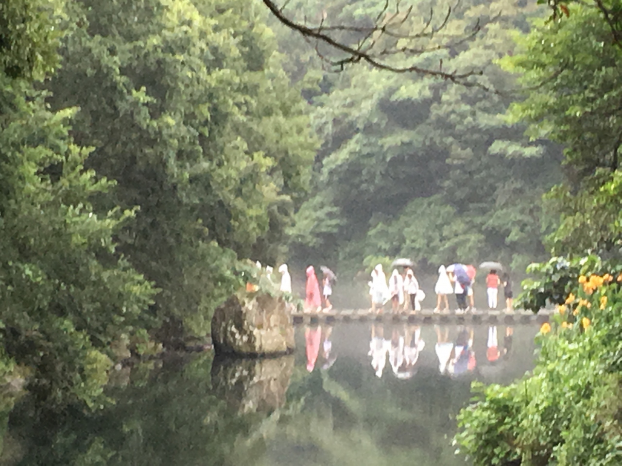西帰浦の繁華街から比較的近いのでかなりの混雑でした。駐車場から歩くと最後の滝に辿り着くまで結構な距離です。清流を橋で跨いだり、流れに配置された石をトントンと渡って越えたり、晴れてたらもっと楽しそうでしたが、雨が降りしきる中、ところどころ滑りやすくて足元ばかり見ていました。少雨の影響で滝の迫力は今ひとつと聞いていたものの、それはそれでほの暗い中で水墨画の如く穏やかな光景でした。