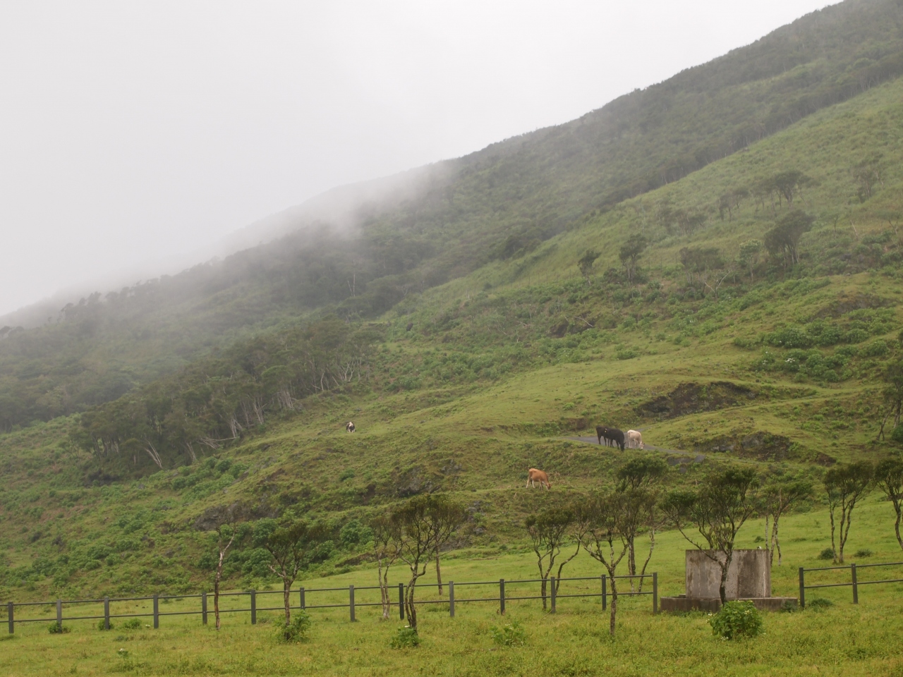 行った日がたまたまそうだったのか、はたまた大体いつもこんな感じなのか。「ふれあい牧場」を標榜しつつ、無人(島の人によると、一人常駐しているスタッフの人も時々敷地内に出かけて不在と)、そして山肌いっぱいに広がる場内にポツリポツリと点在する牛チーム…遠い。「ふれあい」なのに、誰とも…ふれあえない。