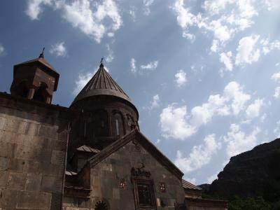 エレヴァンから車をチャーターしビュビュンと1時間半程度(飛ばし過ぎかも)、雄々しい山々の狭間に静かに佇むゲガルド修道院。そのロケーションだけで胸躍りますが、外見からは想像がつかないほど内部はたくさんの空間が連なっています。
