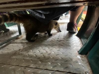 乗車賃はイグアス国立公園の入園料に含まれており、何回でも乗り降り自由です。駅は合わせて3つ。ほどほどのスピードで森の中を進みます。悪魔の喉笛近くの駅では、一見愛らしいけれども実はかなり狂暴なハナグマたちが愛想を振りまきつつ、無賃乗車を試み、座席の下に居座るもんだから車内大騒ぎ。どうか程よいディスタンスを。