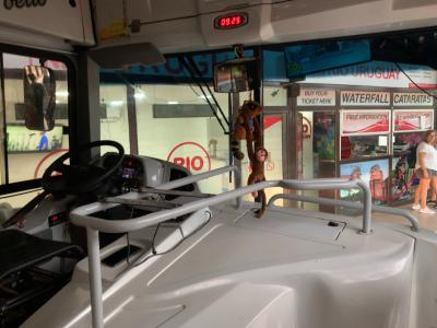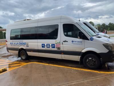 イグアスの滝国際空港に飛行機が着陸するのに合わせて、空港と市街地を結ぶマイクロバスが運行されています。到着ロビーに出てすぐの所にカウンターがあり、予約なしでその場で申し込めました。何人か客が揃うのを待ってから発車する事にはなりますが、ちゃんと宿の真ん前までリーズナブルに運び届けてくれるので安心です。