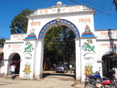 カトマンズのタメル地区から歩いてバスがにぎわっている場所へ行きます。たいていの場合、英語も地球の歩き方に乗っている言葉も通じないので、地球の歩き方の写真を見せて、行きたい場所を示します。おのぼりさん丸出しですが、たどりつくには、それが一番。ミニバンで40ルピーで行きました。降ろされ、まっすぐというバスガイドのジェスチャーにしたがって、歩いてたどりつけました。