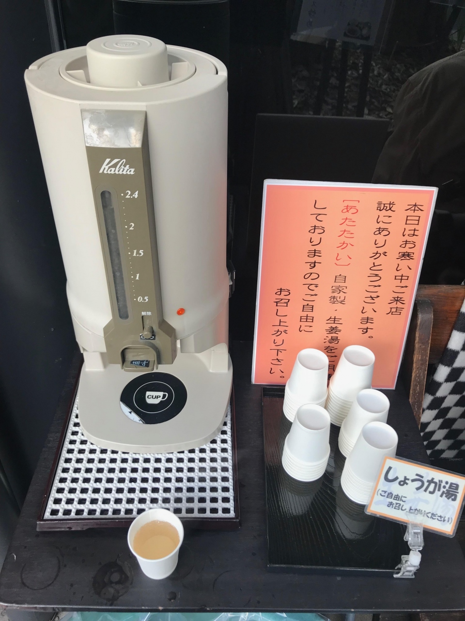 外で待っている間はセルフで入れれるしょうが湯を飲んで温まりました。
