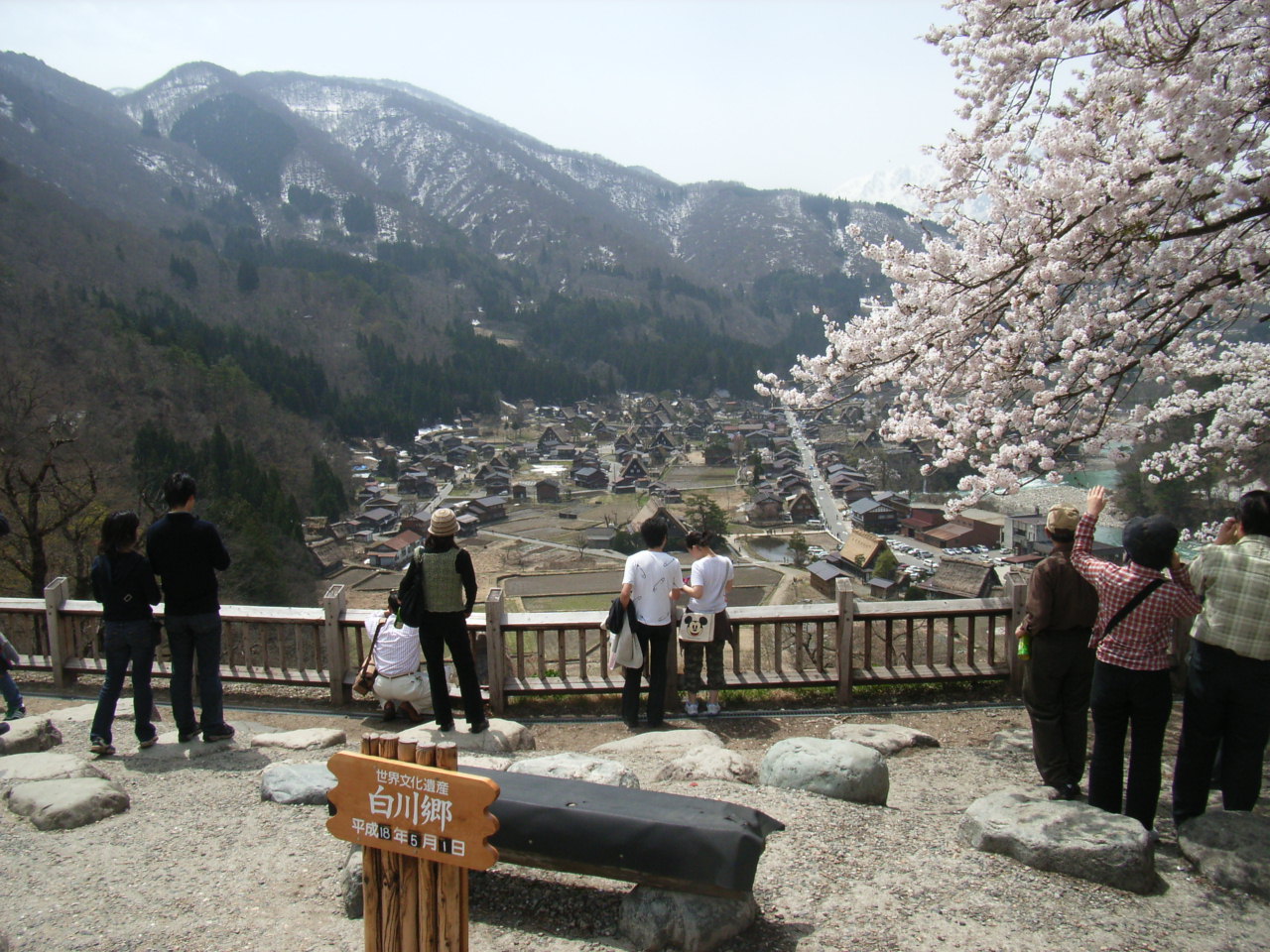 石壁を背景に、桜の木々が美しく咲き誇ります。