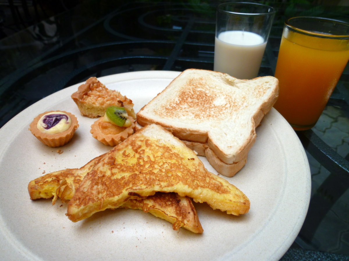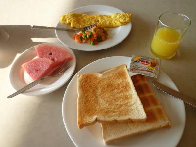 朝食はトースト、卵料理、フルーツ、ジュースなど簡単なもの。