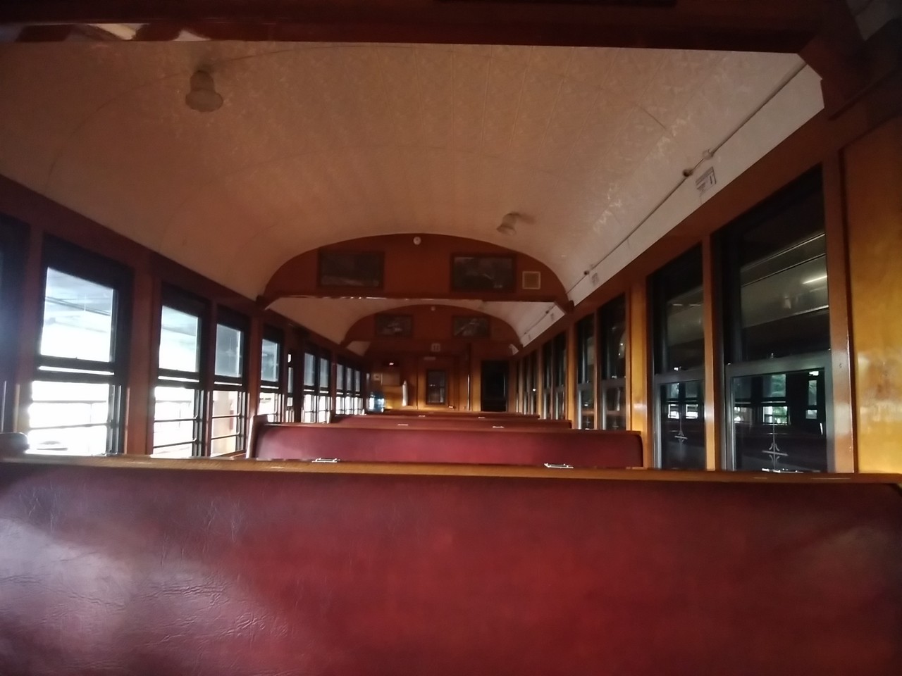 その後特にアナウンスはなくでしたが、車内へ入っていいみたいだったので、早速座席に。シートは横長の革張りで、進行方向右の窓から4人掛けでした。左の窓側は通路です。