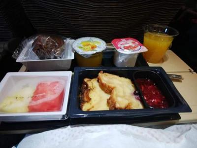 機内食は至って普通でしたが、温かいミールが偏って器からこぼれてて、手がベタベタしたり、あまり見た目はよろしくない感じでした。チキンか、フィッシュかの選択です。