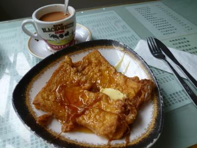 香港国際空港から直接油麻地まで移動してやってきたこのお店。外観からすでに骨董品のような風格、よく映画やドラマの撮影で使われるのも納得。来店は15時過ぎながらも日曜日の為か混雑している。タイミング良く窓側の席に座れた見下ろすとそこは廟街の風景。ここでは強く窓側に座ることをオススメする。廟街に残るレトロなこのお店は60年の歴史があるそうだ。ホットミルクティと一緒に頂いた香港式フレンチトーストはかなり油を感じるが、個人的にはこのお店では味ではなく雰囲気を味わうなんて思ってしまった。