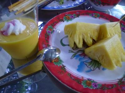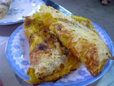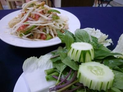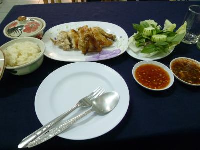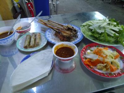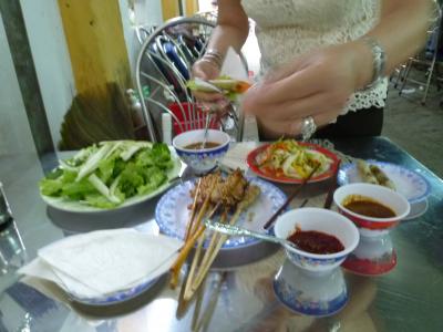 世界遺産の街・ホイアンで色々とベトナムの味が楽しめるこのお店。席に座ると香草・レタス・キューリ等の野菜類が山盛り、酢漬けの野菜(マンゴーも入っていた)生春巻き用の皮が机に並ぶ。つけだれの準備をしていると焼き立てのネムウォン(豚つくね串)7本に揚げ春巻き3本、ミニサイズのバインセオ2枚が更にやってきた。ここで店のママさんが食べ方をレクチャーしてくれる。生春巻きの皮に生野菜や酢漬け野菜を乗せネムウォンヤバインセオ、揚げ春巻きを好みで挟みクルクル巻いてタレに付けて頂く。この作業がとても楽しくて仕方がない。野菜が多いので満腹食べてももたれない。このセットにデザートのパイナップル、別料金の350mm缶のコカコーラとマンゴームースを付けて120,000VND(2013/7当時で約580円)と価格も大満足。3泊の滞在のうち、2回行ってしまいました。