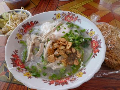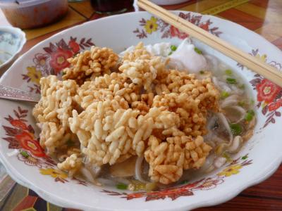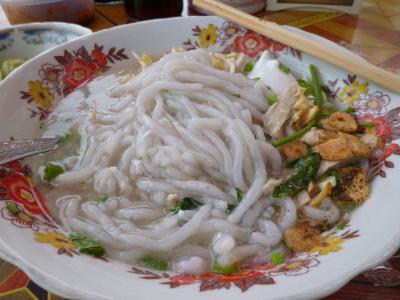 世界遺産のワットシェントーンの近くにあるカオピャックセン(ラオス風うどん)のお店です。卵入りをオススメします。お好みで別皿のモヤシを加えマナオ(ライム)を絞り、ナンプラーを加えて混ぜてから頂きます。スープはあっさり、センはモチモチとした食感です。半分ぐらい食べたらカノムコップ(おこし・別料金)を加えると満足度UPします。これで合計13,000KIP(2013/7時点)とリーズナブルです。