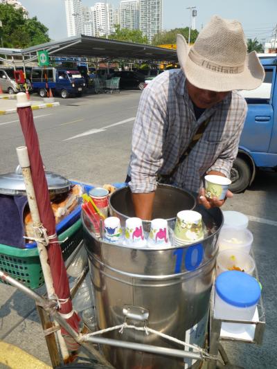 BTSトンロー駅からスクンビット通りSoi38が所謂『トンロー屋台』と言われている。ここに来るとまずSoi38入口のそば右側の果物シェーク屋台でテンモーパン(スイカシェーク)をまず注文する。購入後このシェーク屋台奥に移動してトンロー屋台一押しのバーミーの屋台(小柄な眼鏡をかけた店主のお店)へと行く。いつもバーミナームピセートサイキャオプーを注文。一杯60Bと高めだが、具はカニの身や焼き豚にワンタンと盛り沢山。食べて見れば納得の味です。オススメ、是非お試しあれ。ただし屋台なのでいつお休みかわからず運悪く食べられなかったら御免なさい。
