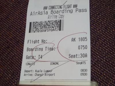 SIN-HNDのSQ片道無料航空券(諸税¥6,850)が手元にあったので片道シンガポール行きの航空券を探していたところに上手くAirAsiaのPromo料金が出てこれを利用することにした。HND-KUL-SINの乗継は『FLY-THRU』が適用されKULで入国不要な上、預けた荷物もシンガポールで引き取りが出来る(自分は機内持ち込み荷物だけですが)