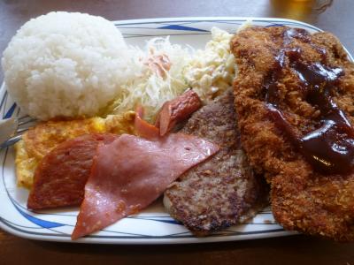 那覇市内中心部から歩くと少し距離がある泊・高橋地区にある50年の歴史を誇る老舗。入店時に自販機でまずは食券を購入する。沖縄の食堂ならやっぱりAランチと注文。軽食の店となっているが…そのボリュームは全然軽食ではない(笑)特大カツ(サクサクです)を動かすとその下にはハンバーグが隠れている。ポーク卵にウインナーにハムそしてサラダ、これにご飯と卵スープとメガトン級だ。思いっきりお腹を満たしたい人には強力オススメします。