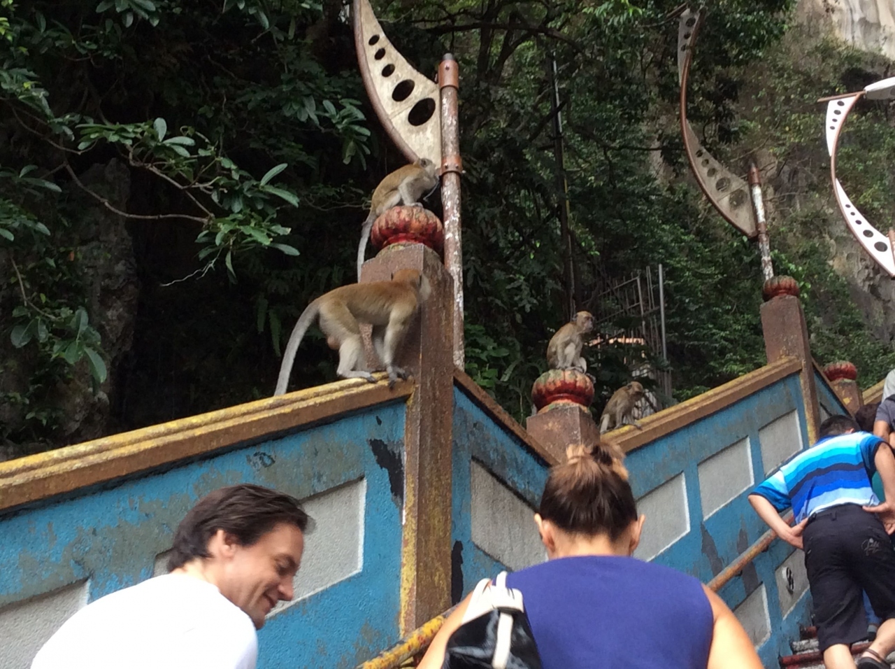 登りの階段、下から見上げてちょっと躊躇しましたけど、たくさんの人につられ、猿のいたずらを見たり、振り返って見下ろしたりしているうちに、洞窟の入口に着きました。 洞窟の中は広く、先に進むと参拝場所がいくつも設けられており、それぞれ昇殿して参拝しておられる姿に接しました。