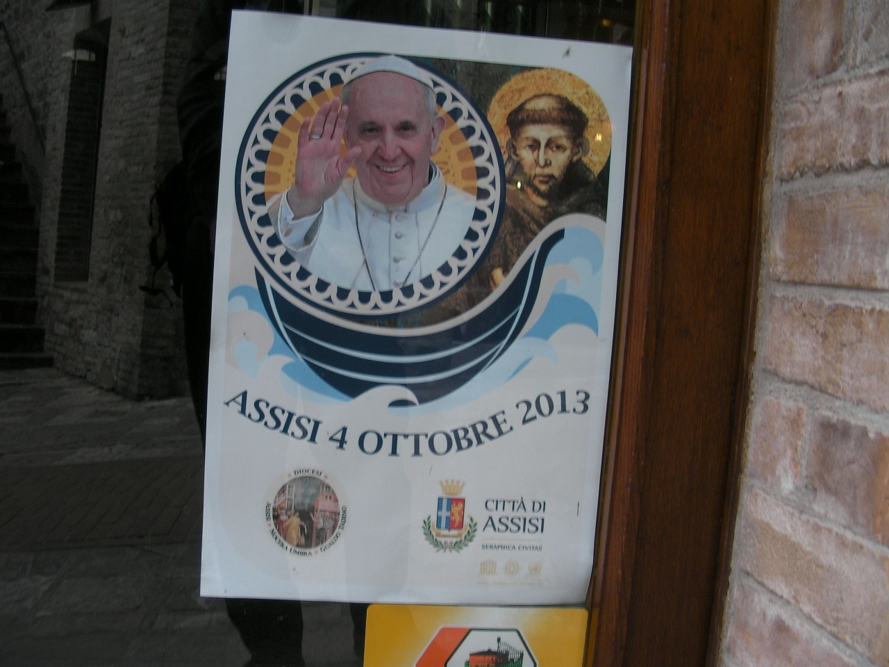 3月に就任したローマ教皇・フランチェスコの来訪を伝えるポスターが、土産物店に。