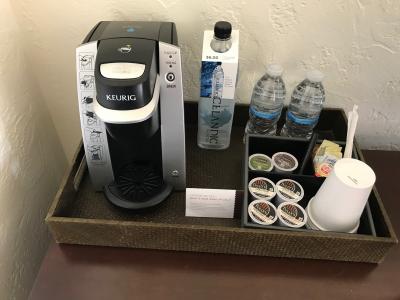 Keurigのコーヒーが美味しかった。メンバー特典でお水も2本いただきました。