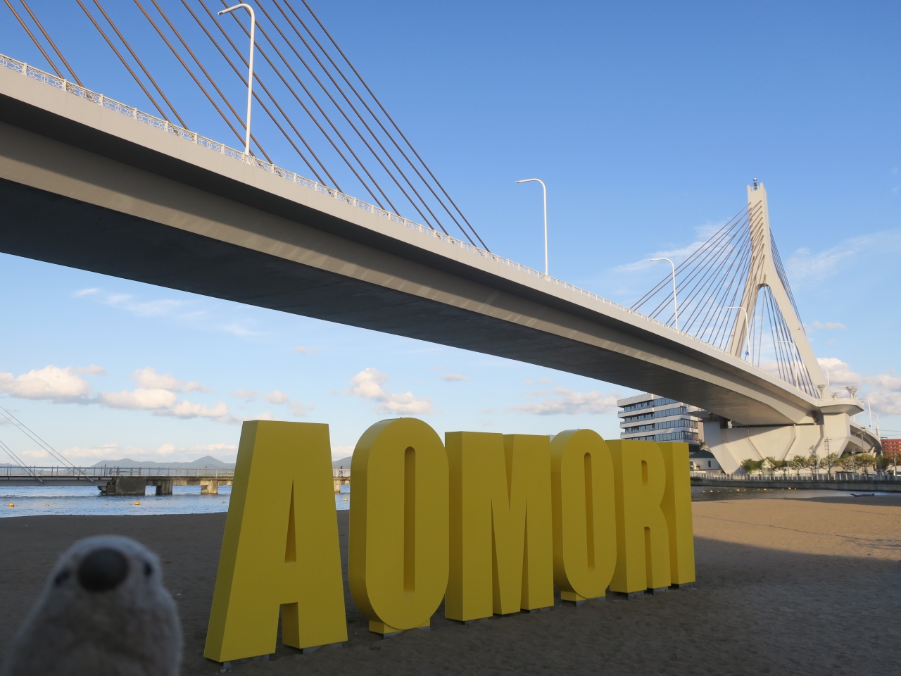 全長1219メートルで青森県内で2番目に長い橋。橋脚などには青森市の「A]の形があしらわれている。白亜の美しい橋で、たもとには「AOMORI」の文字と共に写真の撮れるフォトスポットやA-FACTORYといった商業施設もある。