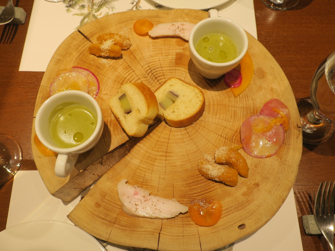 地元の食材を多く用いたイタリア郷土料理が売りとのことで、コースの前菜は地元の檜の切株を丸々つかったお皿にディスプレイされインスタ映えすること請け合い。