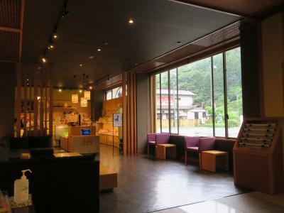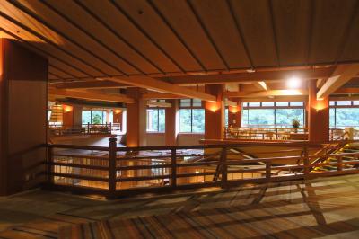 ロビー階からすり鉢状になったスペースの中央部分に小さな舞台がある独特の構造で、チェックイン時には三味線の生演奏がある。このスペースが「鬼滅の刃」の無限城に似ているとかで話題になったらしいが、もちろん鬼舞辻無惨が住んでいるわけではなく、周囲にあるのは個室食事処である。