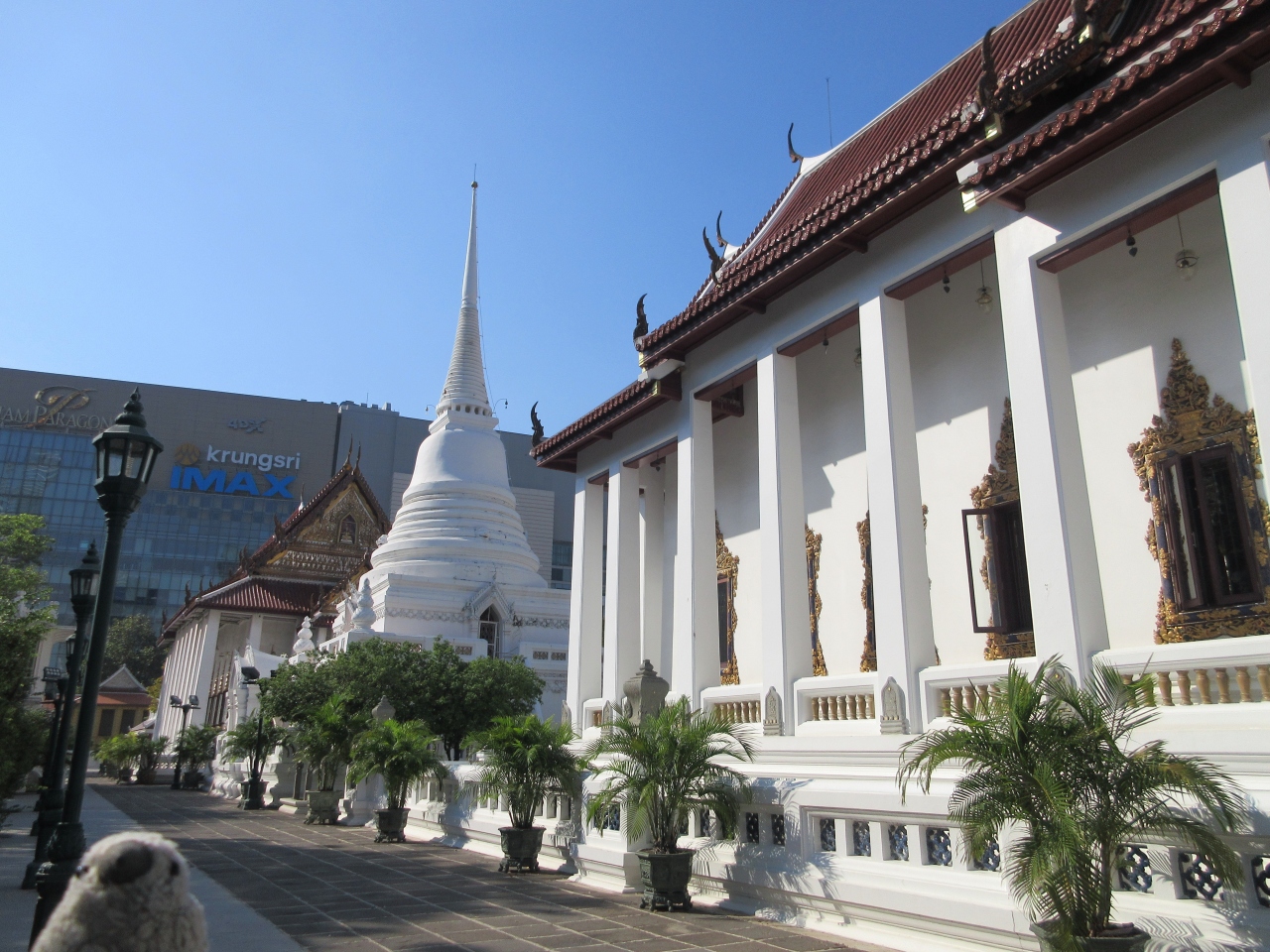 サイアム地区のサイアムパラゴンとセントラルワールドに挟まれた位置にあるお寺。建立は1861年と歴史のあるお寺で、バンコク市内では最も古いお寺の一つ。白亜の仏塔と本堂が印象的で、付近の高層ビルやショッピングモールとの対比が面白い。交通量の多いサイアム地区の喧騒の中で、オアシスのような静かな空間を提供している、貴重な存在。