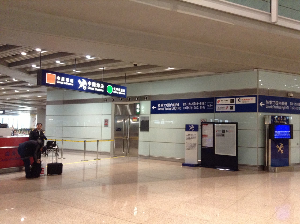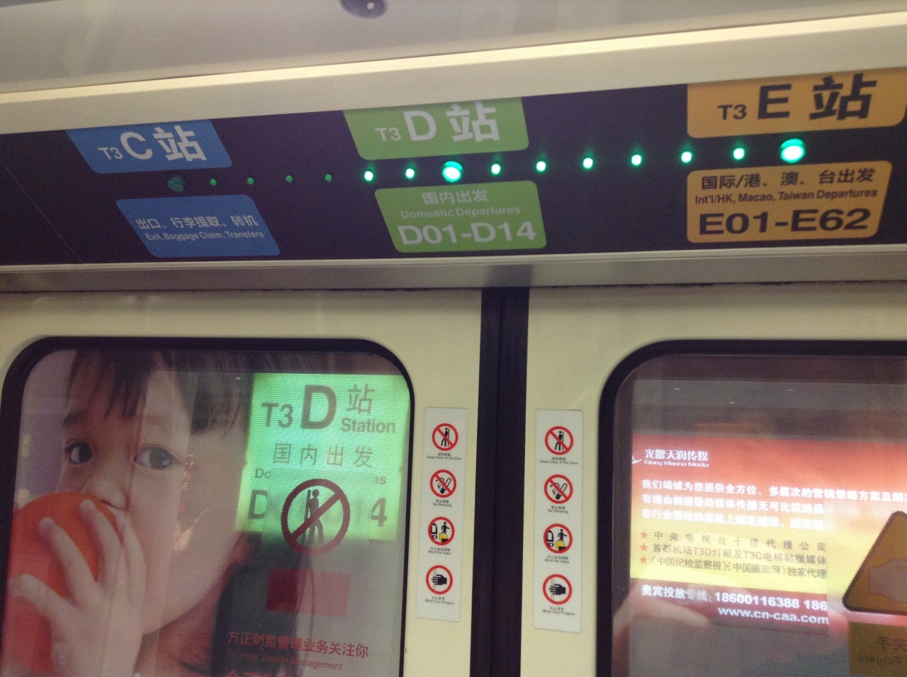国際線でT3Eに到着し、国内線乗継の看板に向かっていくと中国の入国審査があり、その後にT3E→T3Cに移動する鉄道に乗ります。