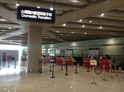 日本で中国国内線の搭乗券ももらっているので、ゲート番号を記入してもらい最初の荷物タグのまま荷物を預けました。カウンターのスタッフはスマホに夢中で搭乗券とパスポートをカウンターに置くとすぐにスマホに夢中になってました。