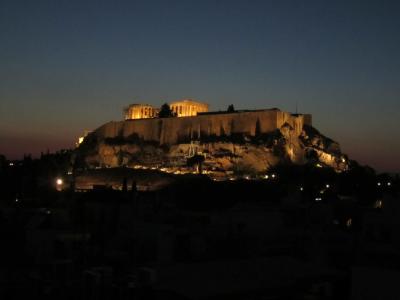 朝食時や夕食時の刻々変化するアクロポリスを見ながらの食事は、贅沢すぎるかもしれません。夜のライトアップも幻想的でした。- 旅行時期
