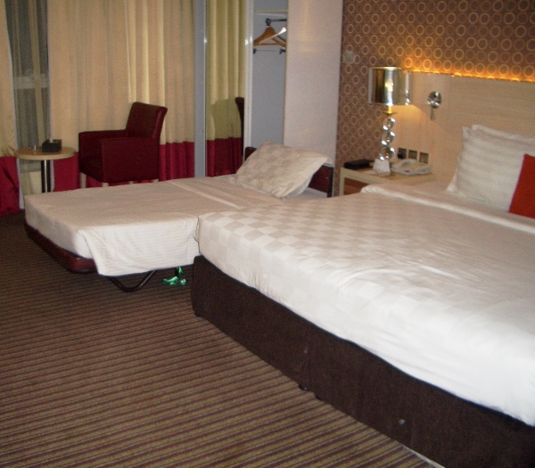 部屋は広く、ベッドも広いのですが、ツインの部屋数が少ないためか、ダブルベッドとエキストラベッドに1人づつ寝ることになりました。エキストラベッドは短く、固いので寝心地は良くありません。これを反省してか、オードブルの差し入れがあった。