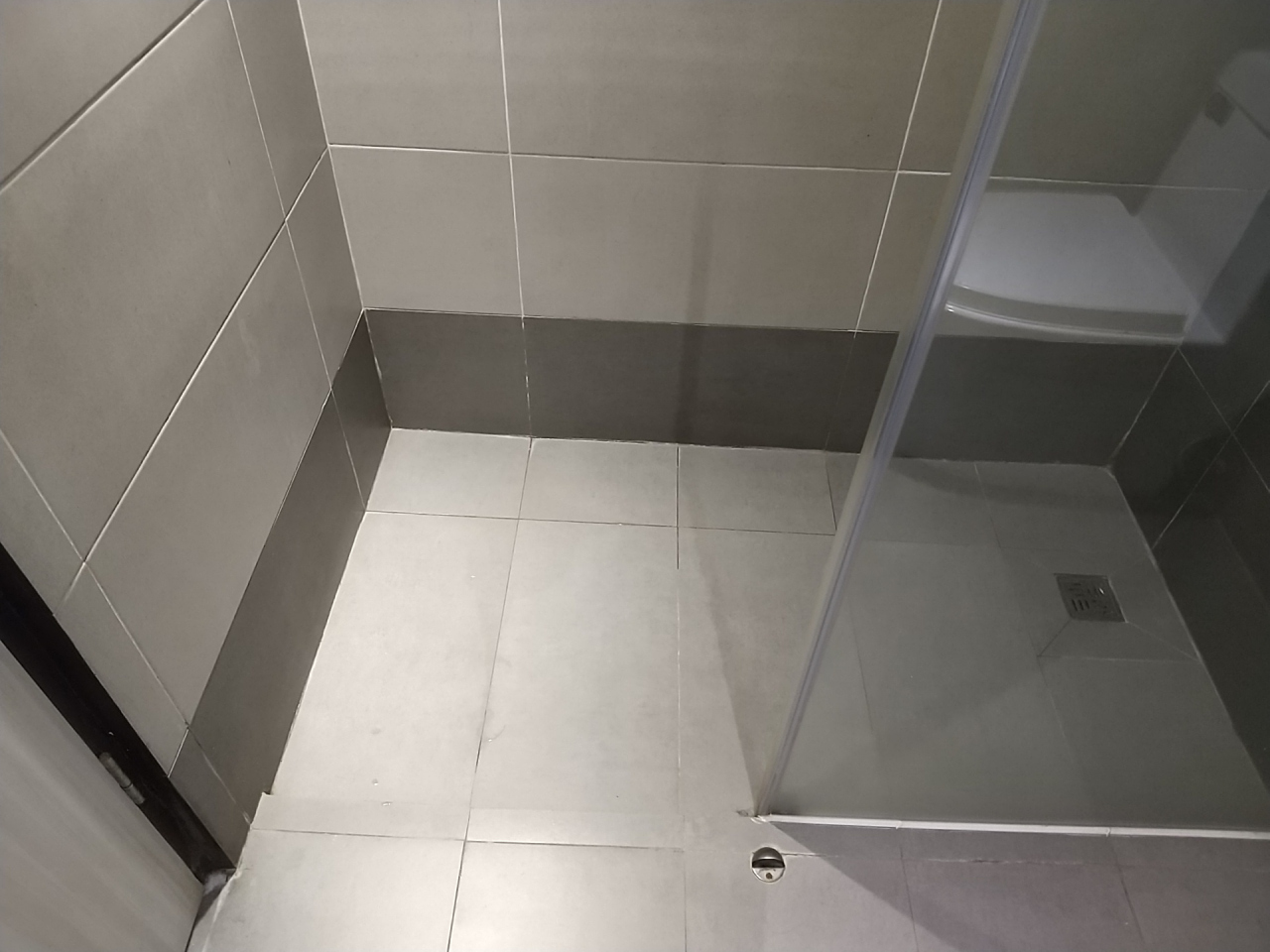 (2) シャワールーム(浴槽無し)に 扉もカーテンも無し(写真)。そのためシャワーを使うと洗面所がビショビショになった。もし、トイレの洗浄ホースを使ったら、洗面所がビショビショになっていただろう。洗面所、トイレ、シャワー一体型なので、洗面所がビショビショになるのは避けられない。