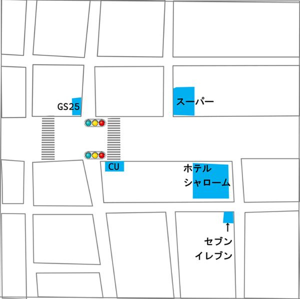 ホテル周辺、徒歩2分以内に、1つのスーパーと3つのコンビニがありました。(図)
