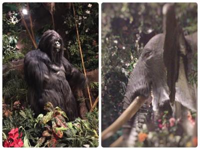 入り口を入ればそこは奥行きのあるジャングル…。壁から、天井からと動物たちが突然動き出します!時間や天候の流れもあるようで、夜になったり、雷雨になったり、動物が騒ぎ出したりしてワクワクします。