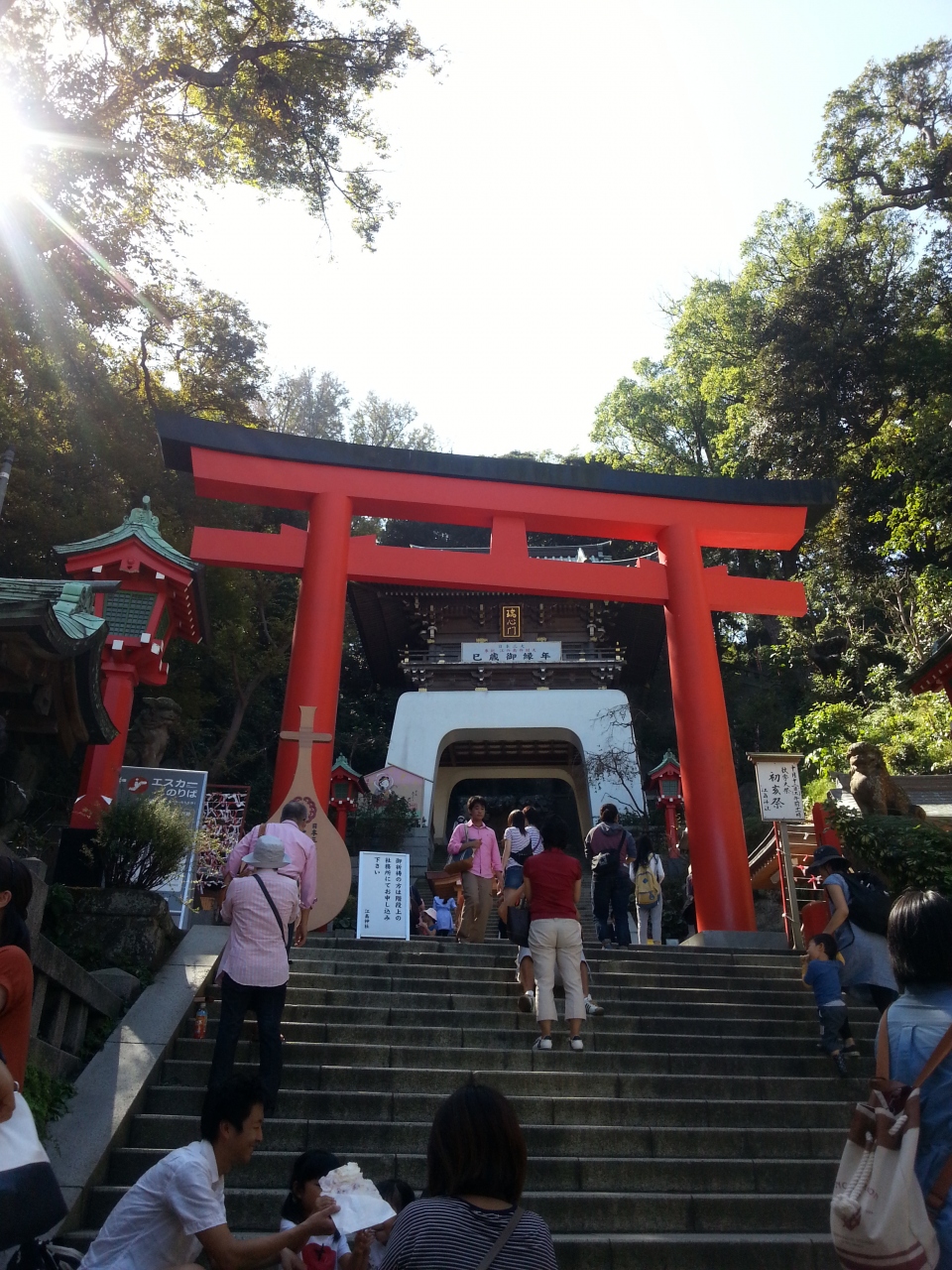 江ノ島散策をして江島神社からさらに奥、岩屋洞窟へと降りていく階段の手前にあります。