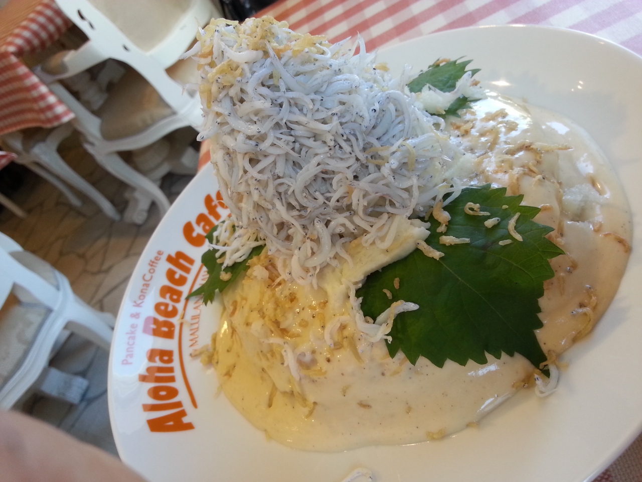 ここのお店、江ノ島名物の「しらす」の入った「しらすパンケーキ」が人気ということで注文してみました。すると重なったパンケーキの上に山盛りのしらす、その上に甘いソースという組み合わせでした。正直な感想として、「しらす」と「パンケーキ」は別にいただいたほうがおいしくいただけそうです。
