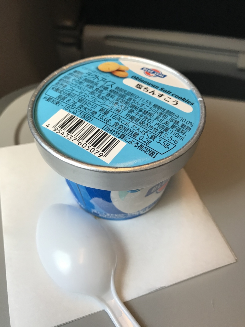 断念して飛行機に乗り込んだのですが、JAL機内で食べることができました!ブルーシールのアイス。300円のカップを機内販売していました。バニラと塩ちんすこう味。