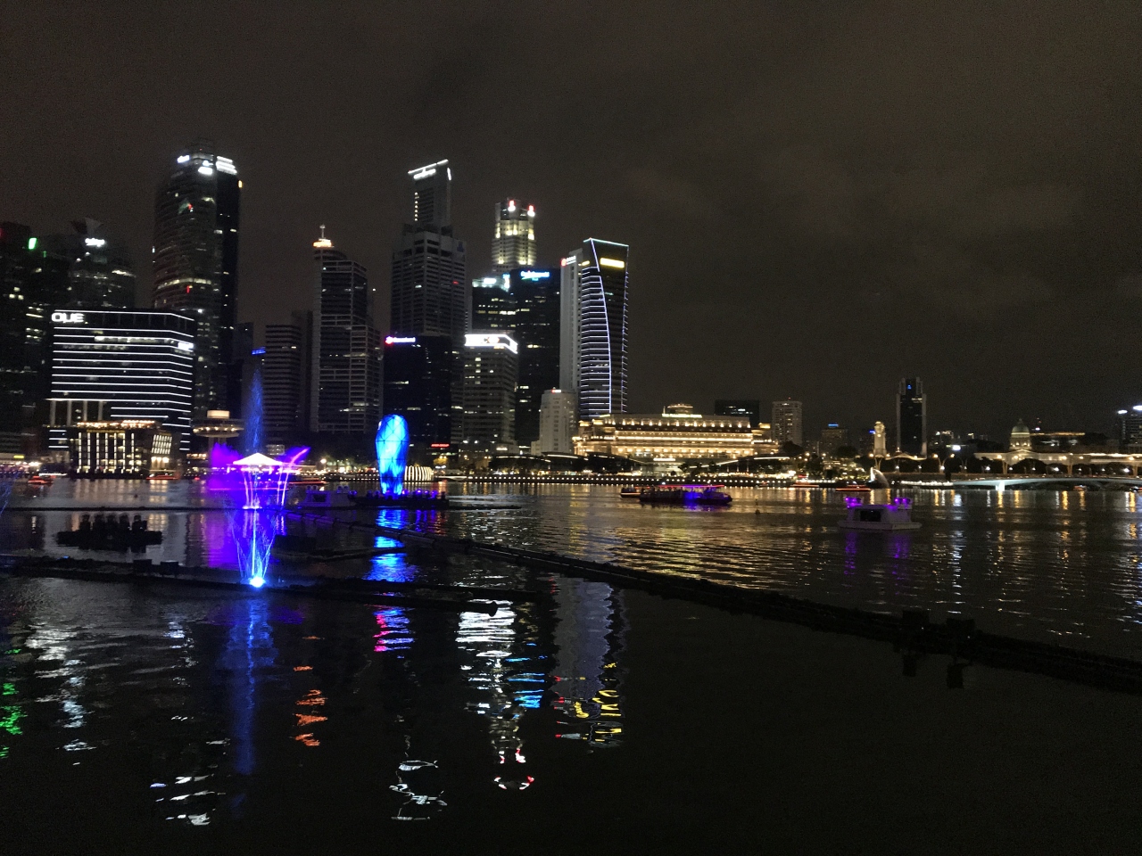 あまりいい場所が開いていなかったので、ヴィトンの方に向かい、1段下のデッキに移動。こちらは真正面ではないこともあり空いていました。10分ほど待ってショーが始まります。ショーが始まる前にマリーナベイサンズから緑のビームみたいなのが海に向けて放たれます。(逆かもしれません、海の上に立っているダイヤモンドみたいなものからマリーナベイサンズにレイザーが飛んでいるのかも)