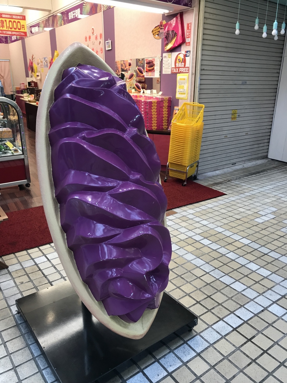 平和通り商店街を中に入って行くと、大きな紅芋タルトのオブジェが目に入ります。