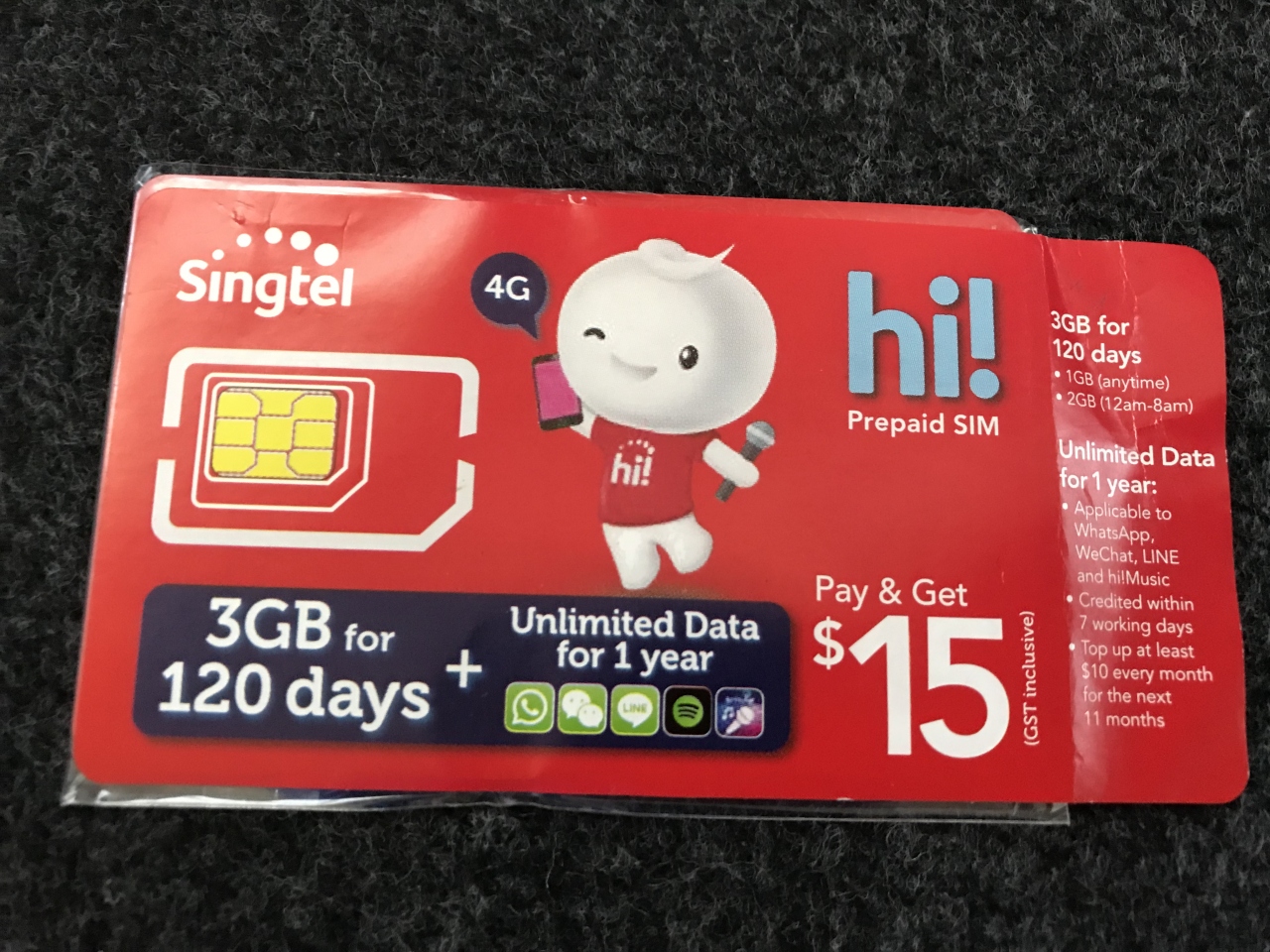 $15 hi! SIM Cardは120日間、1Gbyteいつでも使えるデータ通信と、2Gbyte 8時から12時以外の時間帯に使えるデータ通信容量を含んでいます。