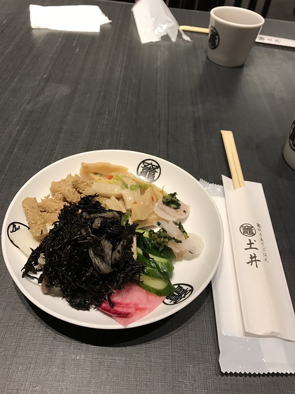 新幹線八条口を出て左に数軒のところに、お漬物屋さん土井志ば漬け本舗があり、店の奥で食事ができます。お漬物などおばんさいがブッフェ式になっているので、お漬物好きにはたまりません。メインのおかずも西京漬けのお魚やお肉があり、とてもおいしいので、ついつい、ごはんのおかわりをしてしまいました。