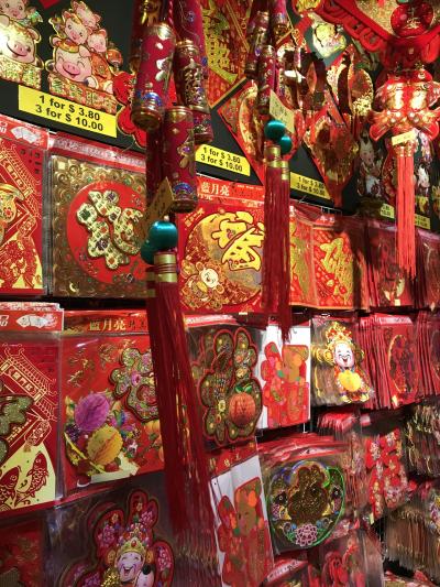 旧正月前だったので、正月飾りもたくさん売っていました。赤と金ピカでなんとも縁起良さそうなので、欲しいなと物色。