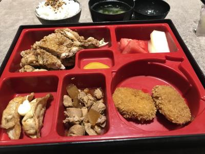 出てきたのはお弁当。お茶、お味噌汁、ご飯。揚げたてのチキンの唐揚げに照り焼きソースがかかってる感じ。餃子も揚げてあり、あとコロッケ。揚げ物だらけでしたが美味しかったですよ~。お腹満たされました。- 旅行時期