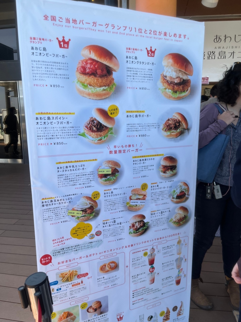 淡路島バーガーがあるだけで、あまりパットしませんでした。有名な玉ねぎのオブジェももっと広い所にあるのかなと思っていましたが、期待外れでした。淡路島バーガーも玉ねぎの揚げ物が脂っこい。ちょっと残念でした。