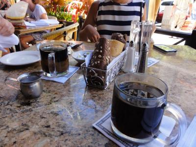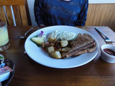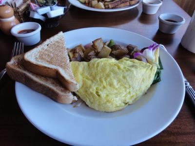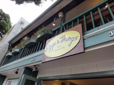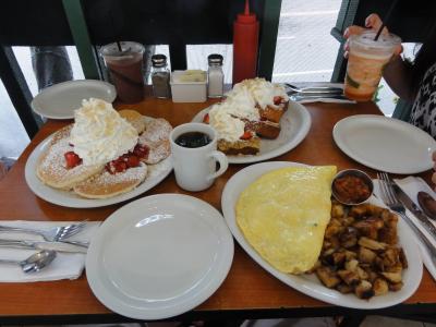 ハワイで初めてのパンケーキはここでと決めてました。ストロベリーにホイップクリームとマカダミアナッツのパンケーキ、ホイップクリームの乗ったトースト、オムレツを3人で食べ切れませんでした。生クリームが結構乗っているので、きついです。でも、美味しかったです。