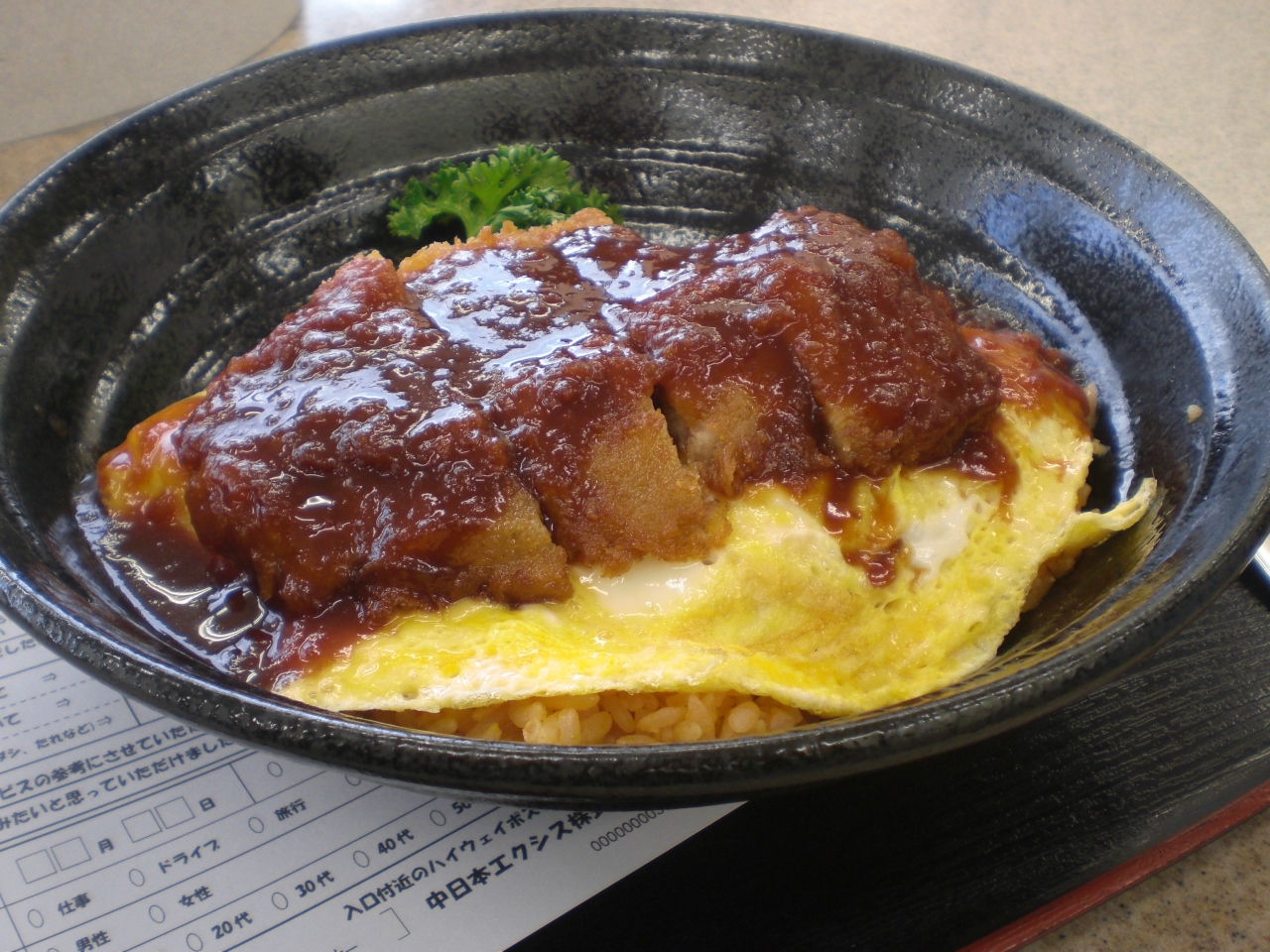 オムライスの上にトンカツがのった食べ物ドンブリです。