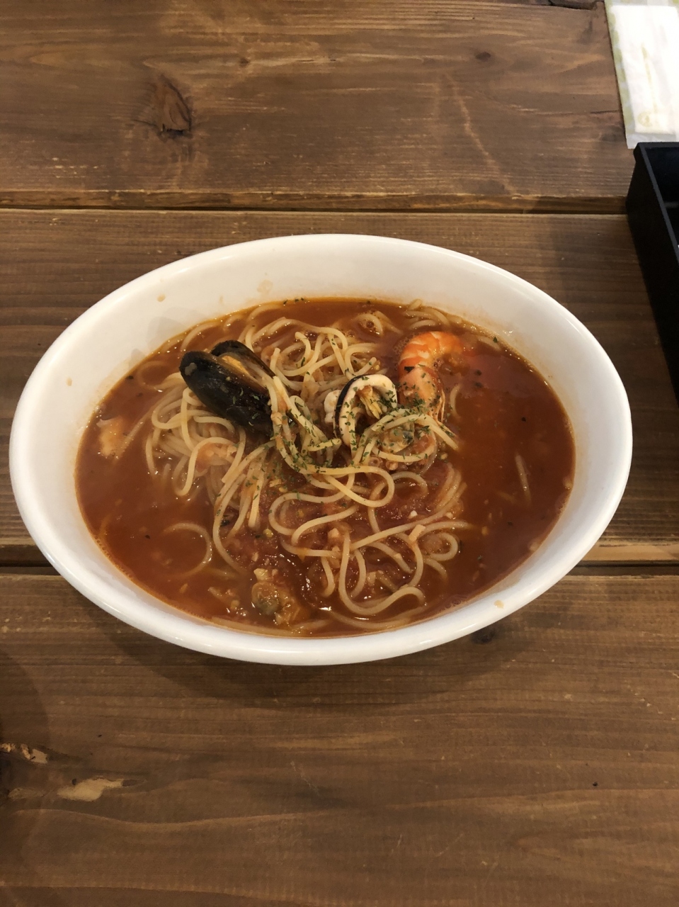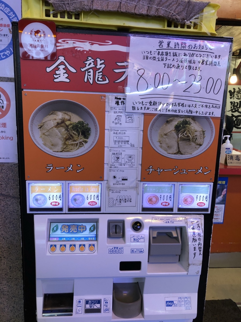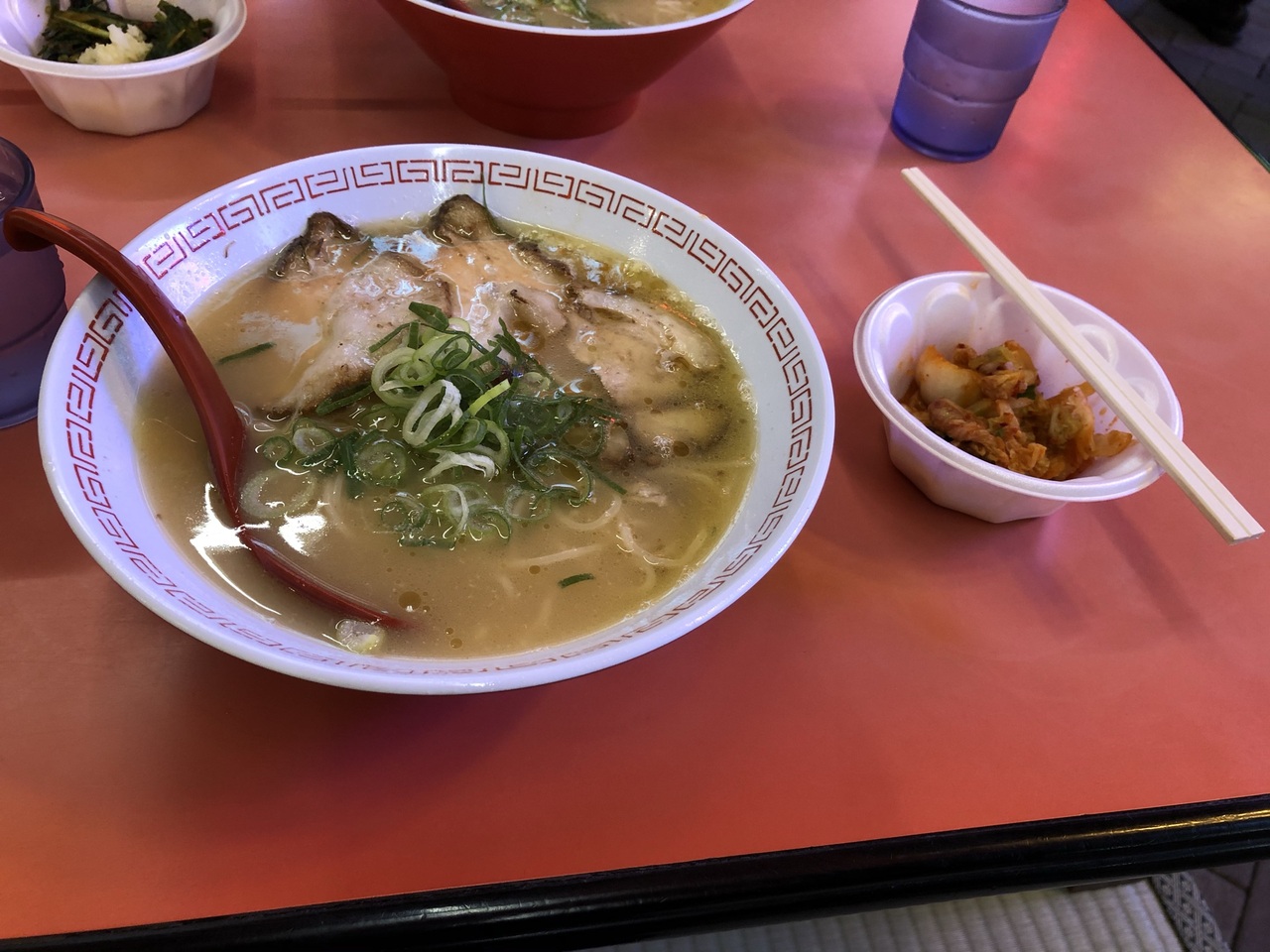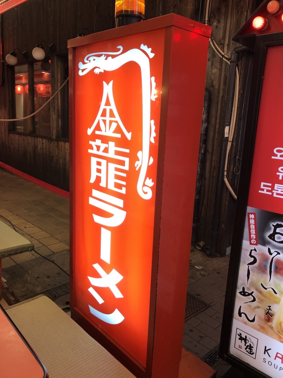 龍の看板が目印のラーメン屋さん。自販機で食券を買ってカウンターで渡すと無料のトッピングについて聞かれました。畳の座席は独特で人が通る場所が近く屋台のような感じです。ラーメン600円。トッピングはキムチ、ニラ、ニンニク。水はセルフ。ラーメンはあっさり豚骨で食べやすかったです。