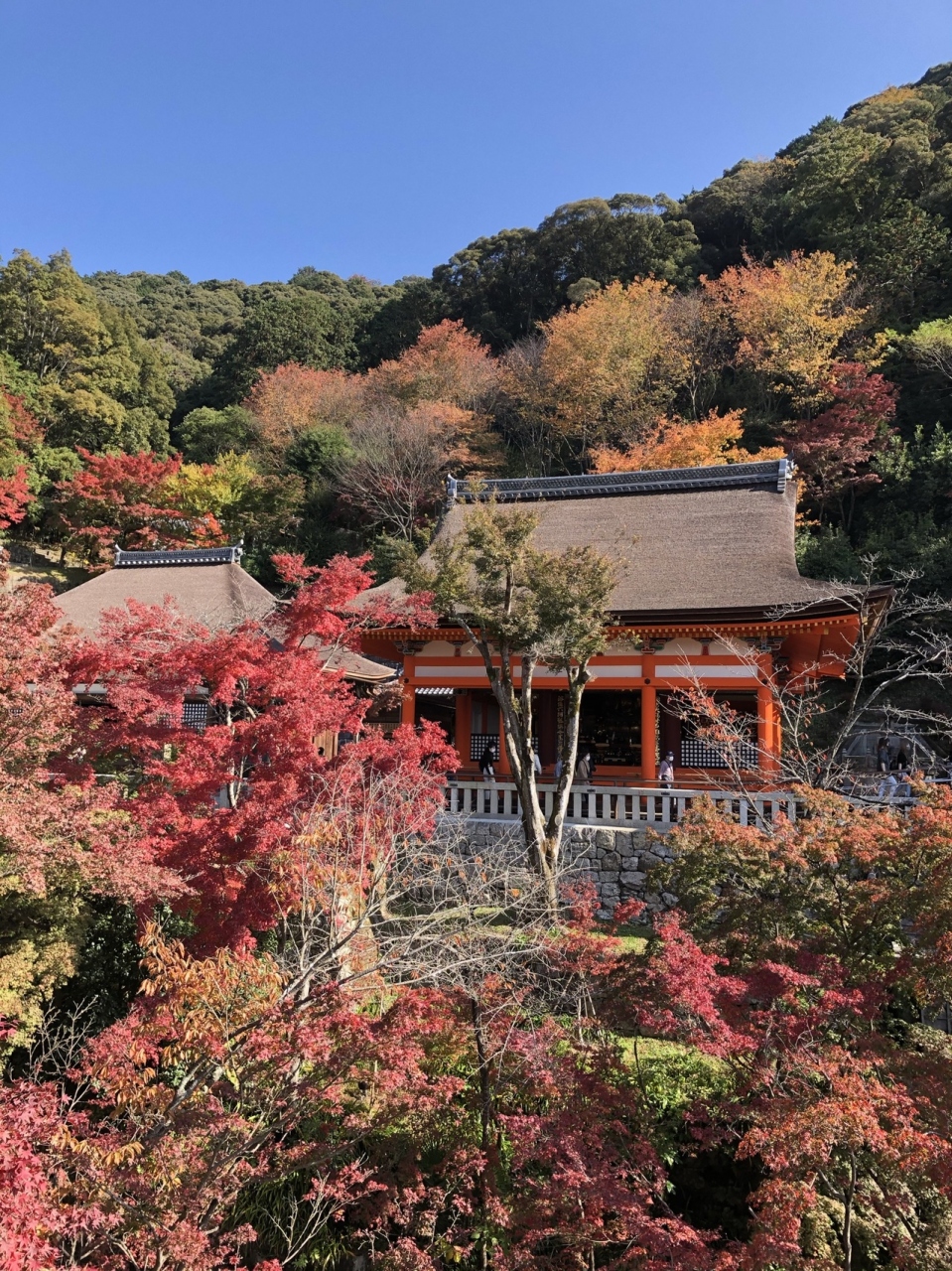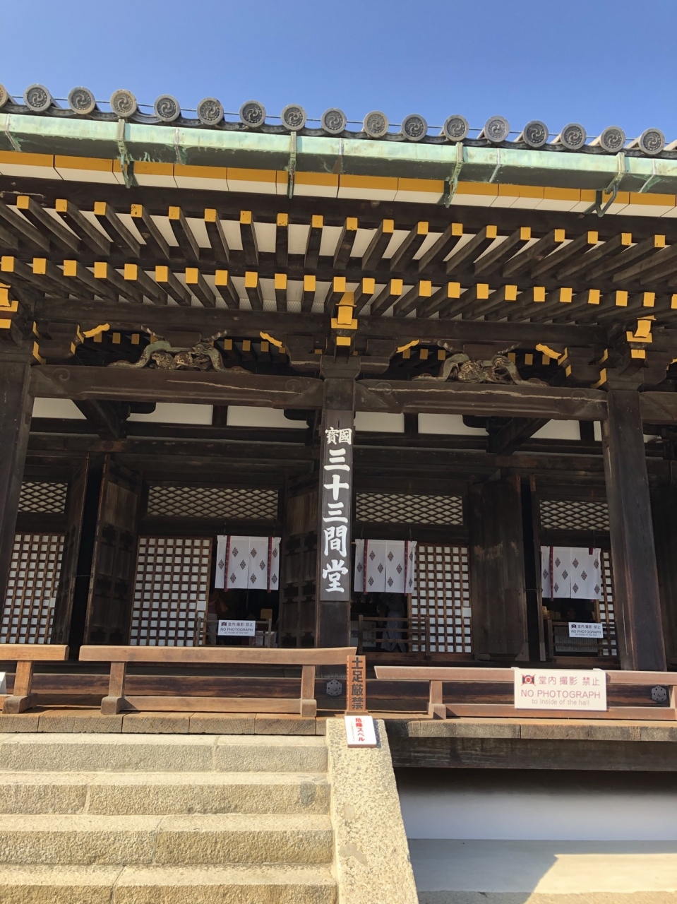 正式には蓮華王院(国宝)といい長いお堂は約120メートルあり正面の柱間が33あるところから三十三間堂と通称され堂内には1001体もの観音像がまつられています。JR京都駅から徒歩20分程で到着。参拝料は大人600円。堂内は撮影禁止。靴を脱いで靴箱に入れて見学。観音立像は圧巻です。入口と出口は明るいが途中の展示場所で暗めの所もありました。