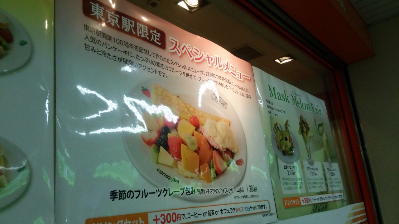 平日なら席だけ予約可能との事で17時から予約し訪問。お店の場所は東京駅八重洲北口改札すぐのキッチンストリートにあります。店の前は通路でかなりの人が通行し店内は狭いです。デザートには300円税抜でコーヒー、紅茶、カフェラテ(HOT/ICE)つけられました。東京駅限定のスペシャルメニューと紅茶を注文。季節のフルーツクレープ包み、クレープとパンケーキ、フルーツ、アイス、生クリーム、メイプルシロップ(はちみつ入り)とボリューム満点だけど全体のバランスがイマイチでした。同行者の食べていたケーキの方が良かったかもと思いました。